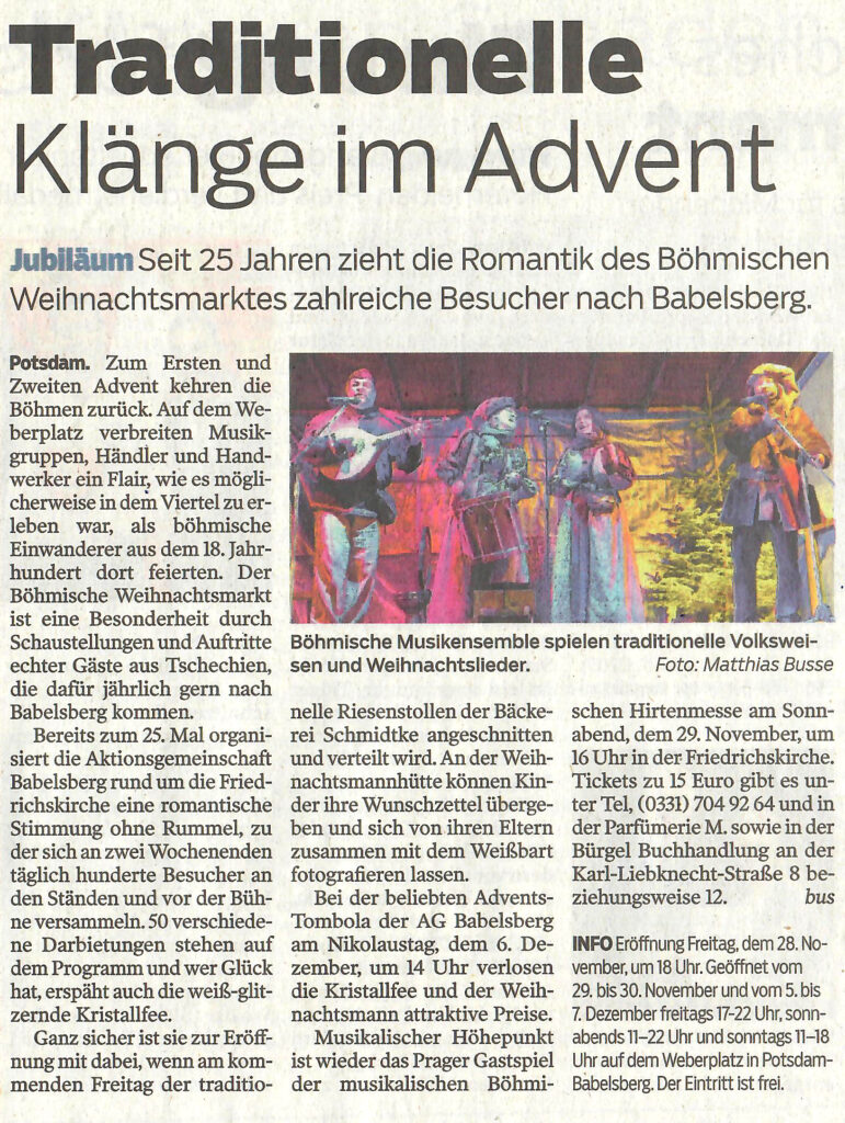 28. November: „Böhmischen Hirtenmesse“ in der Friedrichskirche. Die Gesangssolisten, der Chor und das Orchester aus Prag gastieren bereits zum 11. Mal in Babelsberg.